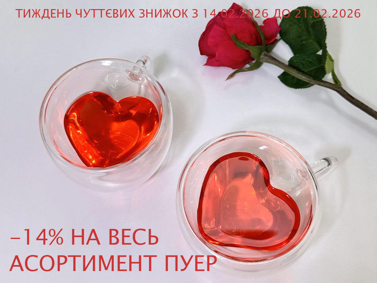 Знижка 14% на весь асортимент пуер при замовленні на сайті chai-puer.com діє з 14.02.2026 до 21.02.2026.